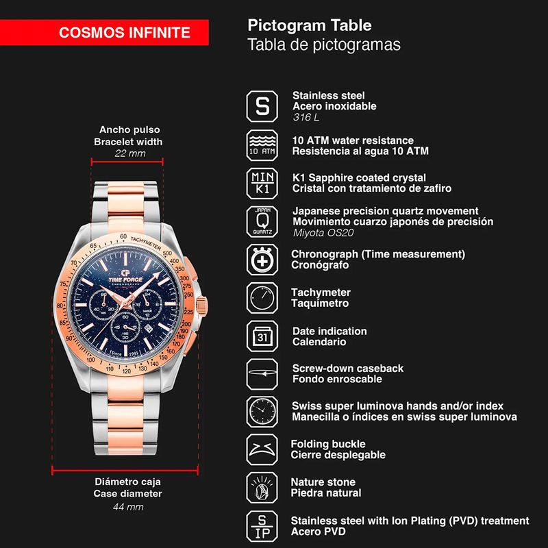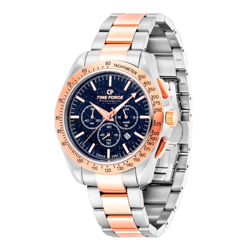 Time Force es una marca de relojes fundada en 1991 en Suiza reconocida por combinar la precisión suiza con un diseño moderno, deportivo y elegante. Desde sus inicios se ha destacado por ofrecer relojes de alta calidad a precios accesibles. Bajo el eslogan “Ultimate Concept Watches”, la marca busca transmitir fuerza, innovación y estilo, ofreciendo modelos tanto para hombres como para mujeres, con colecciones que equilibran moda y funcionalidad. Time Force mantiene una identidad dinámica y contemporánea, orientada a quienes buscan un reloj con carácter, de buena calidad y diseño distintivo.